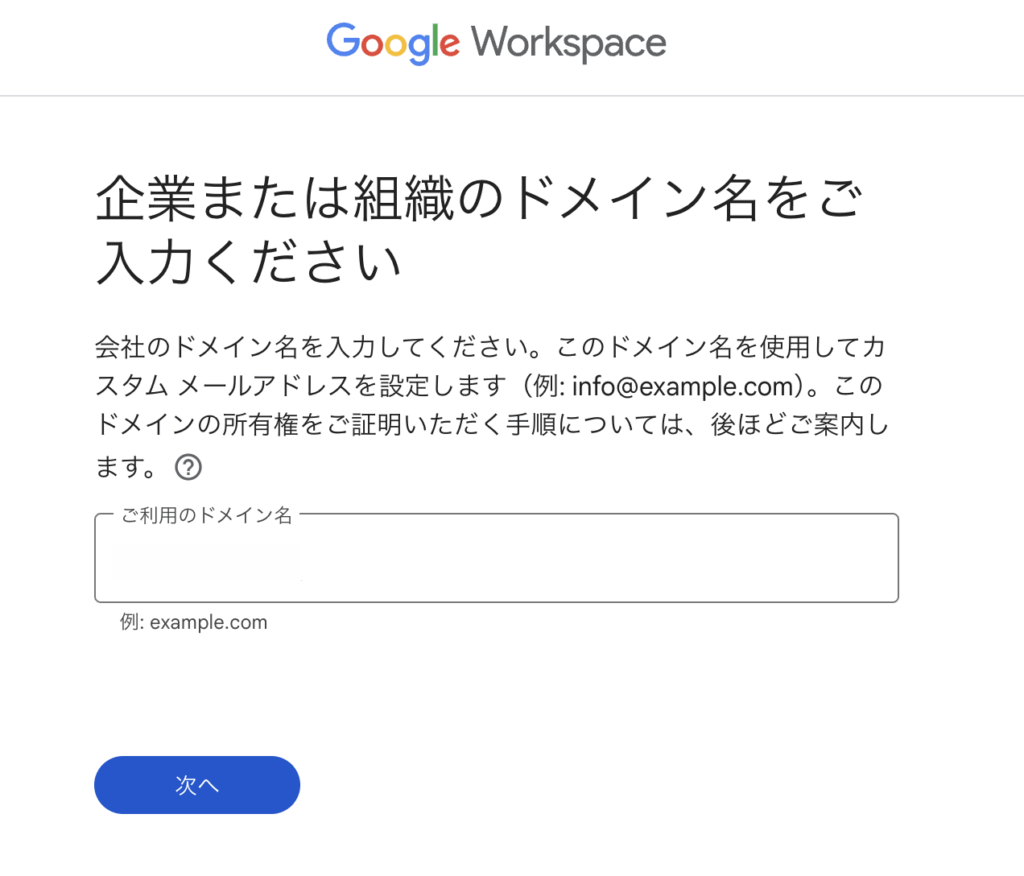 次に、Google Workspaceで利用する会社のドメインを設定します。